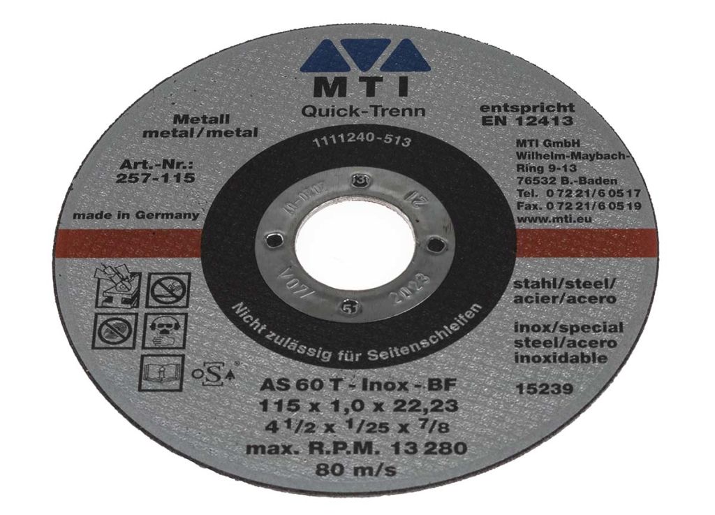 | Product description | MTI Aluminium Oxide Cutting Disc, 115mm x 1mm Thick, 1 in pack |