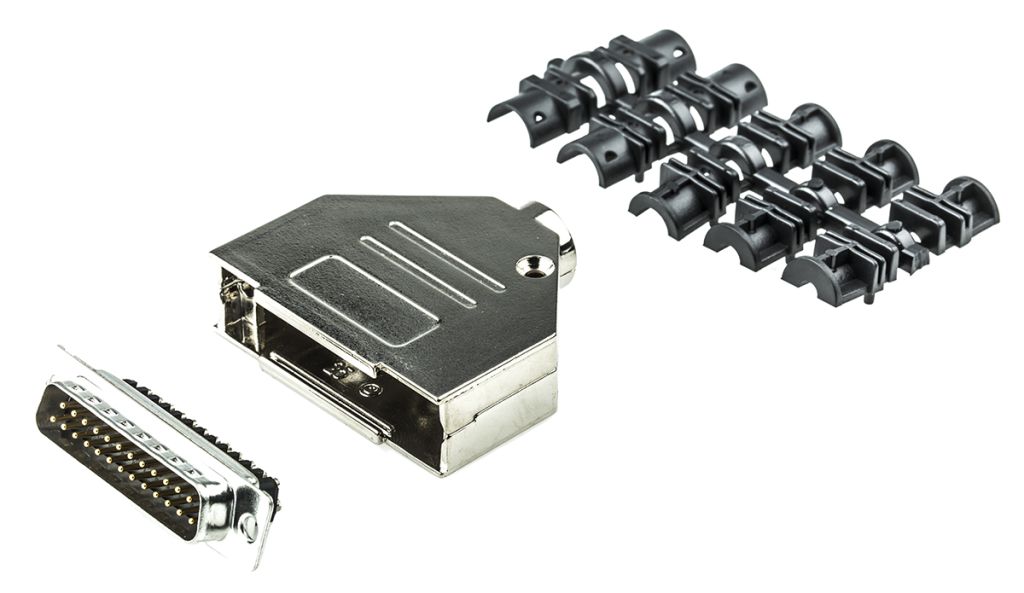 15 and 25-way D-Sub connectors with direct screw connection supplied as a kit, including hood and screws