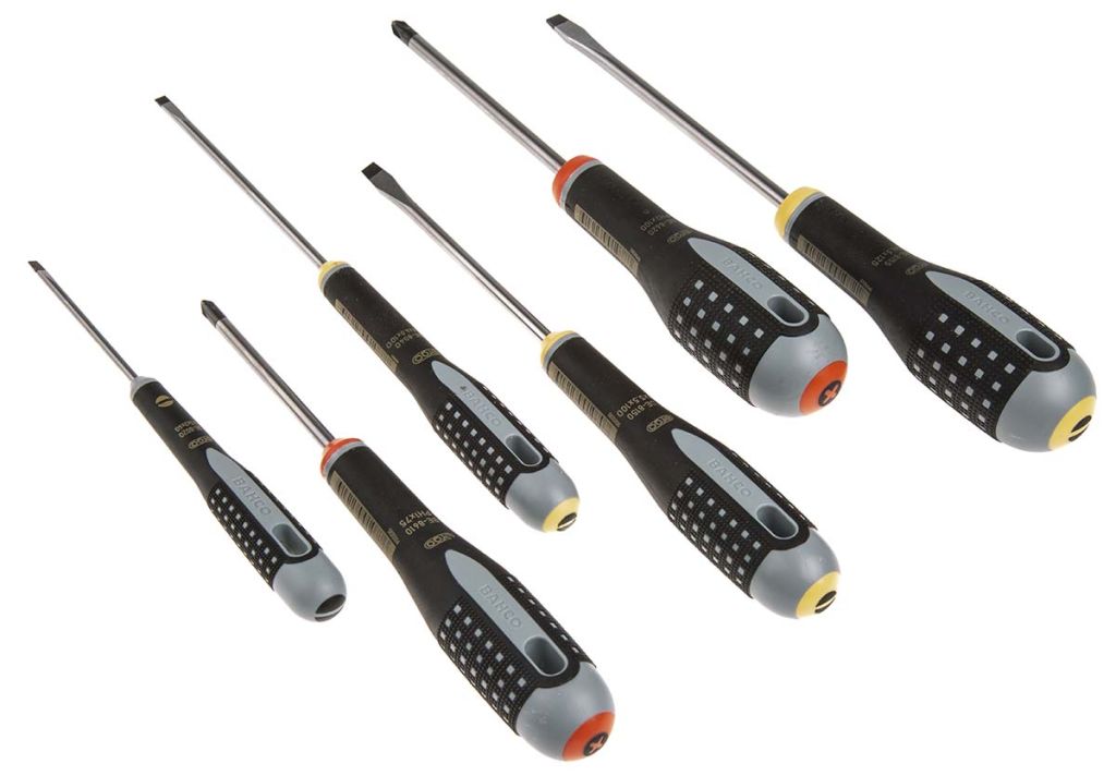 Bahco professional Ergonomic Screwdriver sets contain the most popular sized screwdrivers. These 6 piece screwdriver sets will cover all your needs in any giving situation. These screwdrivers are designed to fit slotted, Philips and pozidriv head screws. The ergonomic designed screwdrivers come with a three component handle with a specially designed grip to provide secure handling even with oily greasy hands but also to reduce user fatigue over extended periods of use. The colour coded ends and rings on these screwdrivers make it much easier to identify the right tool that you need even in a busy tool box. The finish of these screwdrivers are chrome plated with black oxide tips for durability and longer tool life. They also come with a built in blade bolster for use with a wrench to provide extra torque.