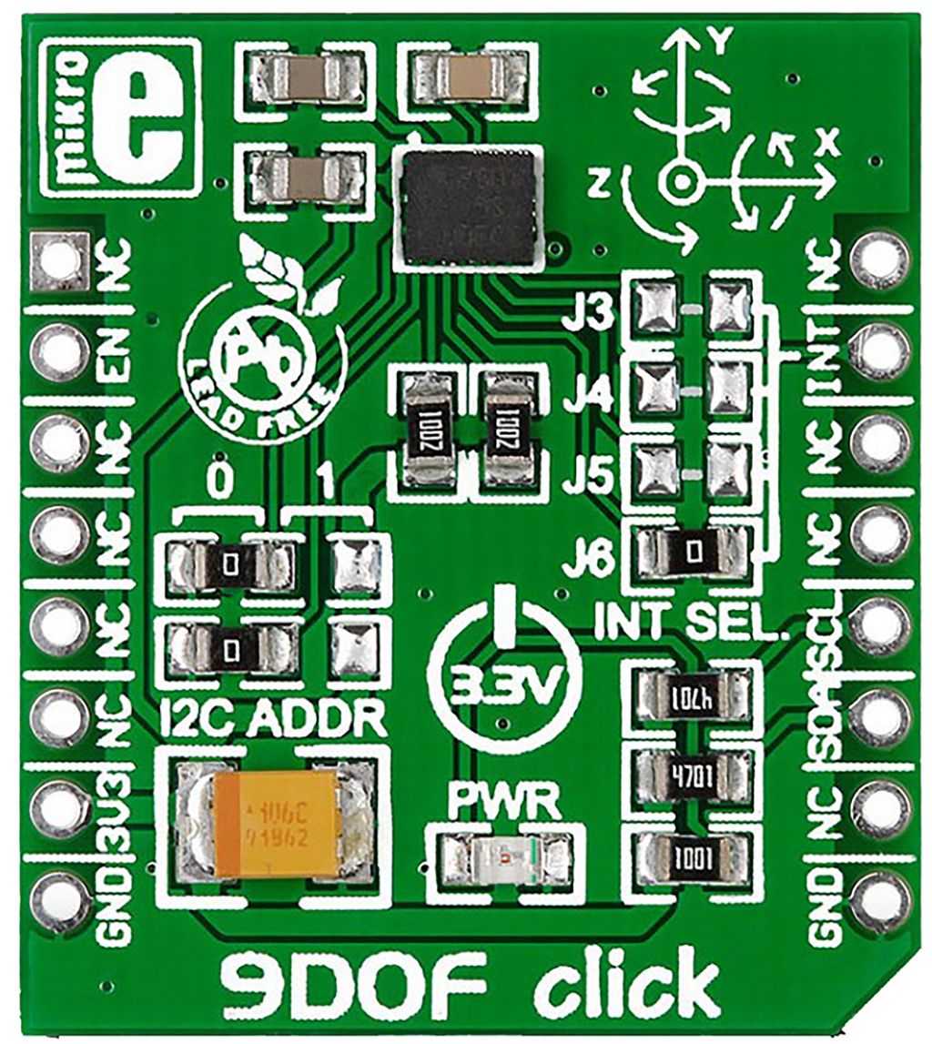 The Click accessory modules plug into the MikroBUS sockets in MikroElektronika microcontroller development boards. 9DOF click has an LSM9DS1 device that combines a 3-axis gyroscope, 3-axis accelerometer and a 3-axis magnetometer on a single chip.