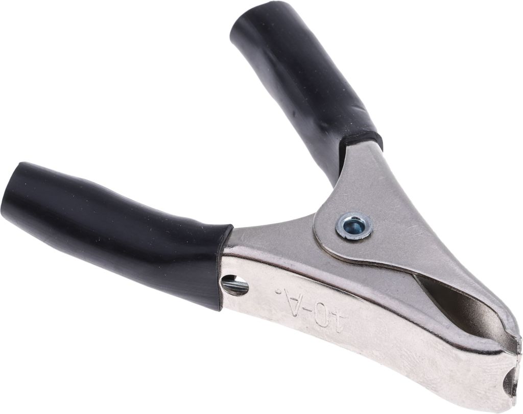 Micro plier-type battery clips with screw or crimp connection. These battery clips are made from nickel-plated steel (stock numbers 714-8253 and 714-8257) or solid copper (stock numbers 714-8266 and 714-8269). The length of these plier type battery clips is 58mm with a 19mm maximum jaw opening.
