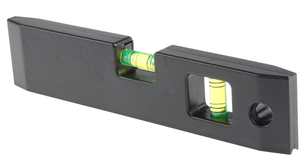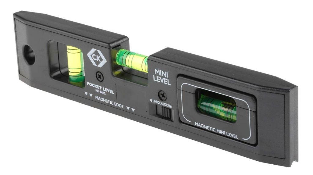 The black plastic body incorporates a removable vial which acts as a mini level (to check levels when installing switches or sockets). A magnetised sole plate holds the level in place on ferrous metal surfaces