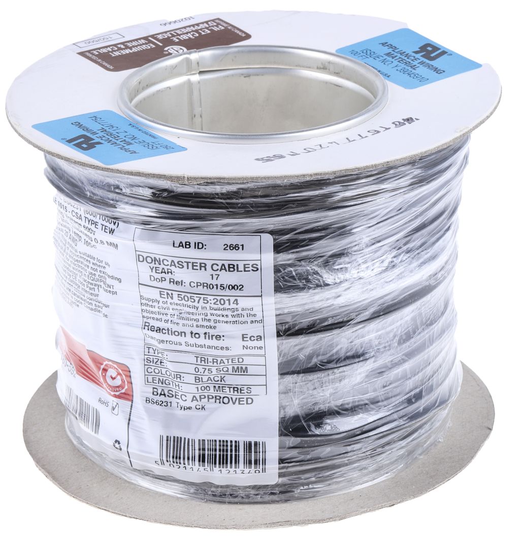 | Product description | RS PRO Black 0.75 mm² Tri-rated Cable, 24/0.2 mm, 100m |