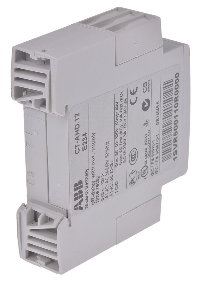 | Product description | ABB SPDT Timer Relay, OFF Delay, 24 → 240 V ac, 24 → 48V dc 0.05 s → 100h, DIN Rail Mount |