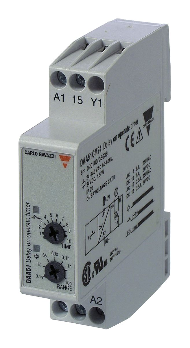 | Product description | Carlo Gavazzi SPDT Timer Relay, ON Delay, 24 → 240 V ac, 24V dc 0.1 s → 100h, DIN Rail Mount |