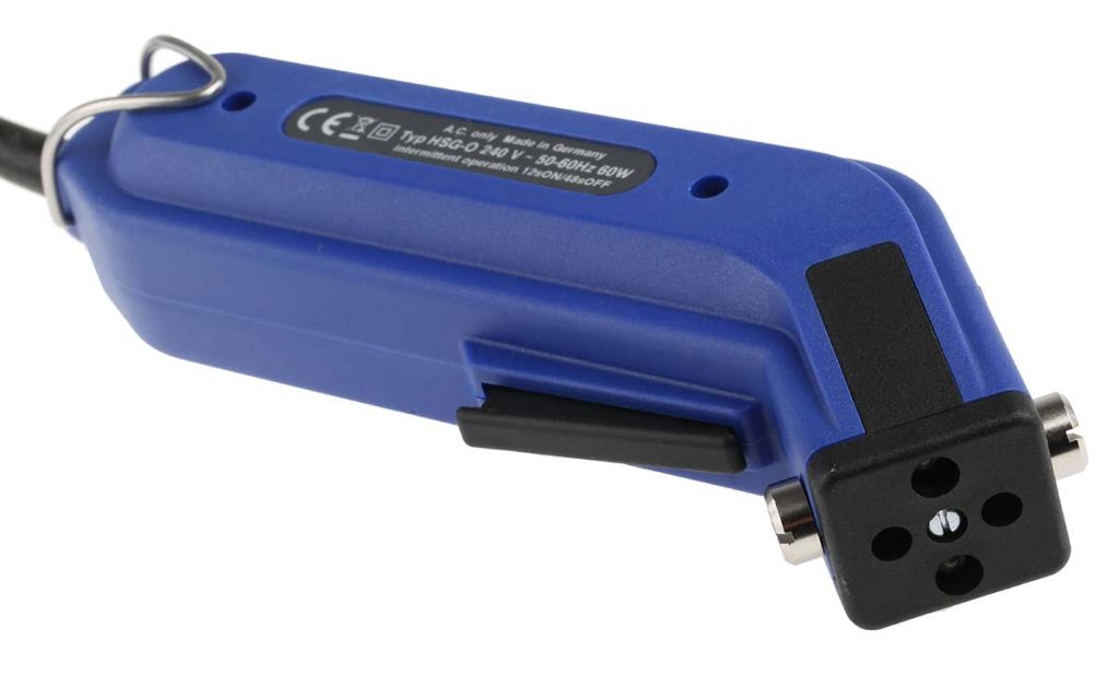 The HSGO hot cutting tool is a light, robust, hand-held device to cut synthetic fabrics such as braided sleeving. It heats up quickly with the press of a button and cuts the sleeving cleanly in a matter of seconds. The individual strands melt and fuse together, preventing the sleeving from fraying.