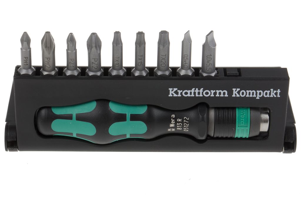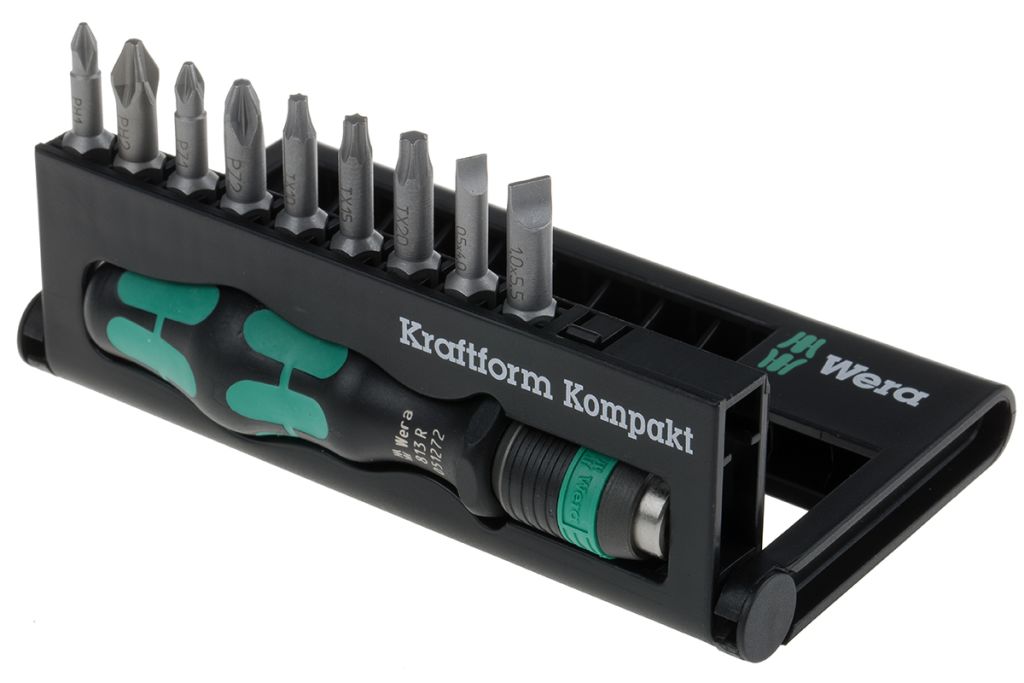 This is the most compact screwdriver set from Wera, designed to be the ideal set for everyday use. The set features 9 viscous Wera bits, that are suitable for everyday use, and one 813 R Kraftform Rapidator quick-release chuck for high working speeds. The set comes in its own robust storage box that folds out for access to the bits.