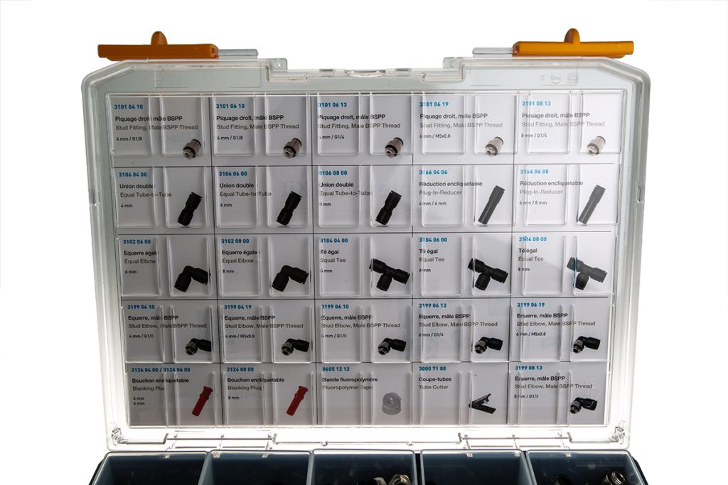 | Kit Contents | 0605 12 12 Fluoropolymer Tape, 3000 71 00 Tube Cutter, 4 mm (Dia.) Blanking Plugs x 20, 4 mm (Dia.) Equal & Unequal Tee x 10, 4 mm (Dia.) Male Stud Coupling x 10, 4 mm (Dia.) Male Stud Elbow x 20, 4 mm (Dia.) Reducer x 10, 4 mm (Dia.) Tube to Tube Connector x 10, 6 mm (Dia.) Blanking Plugs x 20, 6 mm (Dia.) Equal & Unequal Elbow x 10, 6 mm (Dia.) Equal & Unequal Tee x 10, 6 mm (Dia.) Male Stud Coupling x 10, 6 mm (Dia.) Male Stud Elbow x 20, 6 mm (Dia.) Reducer x 10, 6 mm (Dia.) Tube to Tube Connector x 10, 8 mm (Dia.) Blanking Plugs x 20, 8 mm (Dia.) Equal & Unequal Elbow x 10, 8 mm (Dia.) Equal & Unequal Tee x 10, 8 mm (Dia.) Male Stud Coupling x 10, 8 mm (Dia.) Male Stud Elbow x 20, 8 mm (Dia.) Tube to Tube Connector x 10 |