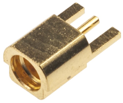 MMCX microminiature 50 Ohm RF Coaxial PCB jack receptaces with snap-on couplings for easy connection or disconnection. These MMCX microminiature RF coax PCB jack connectors have a gold plated brass body, teflon insulator and are available in a variety of mounting options and orientations. Stock numbers 759-5306 and 896-7462 are edge mount PCB SMT jacks with leads that are orientated towards the feed holes.