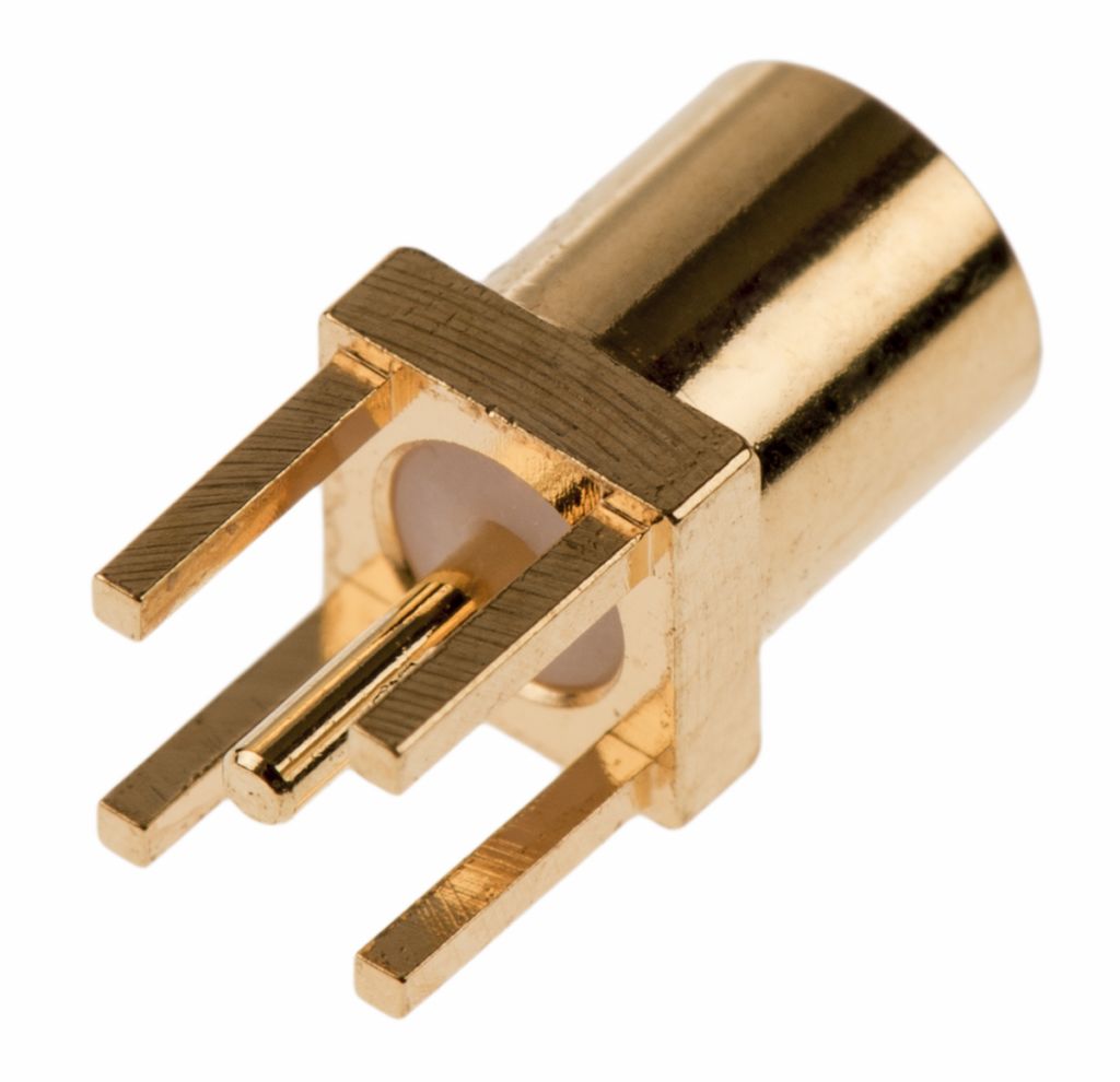50 Ohm MMCX RF coaxial PCB jack connectors with solder legs, TEFLON dielectric, a gold plated brass body and gold plated centre contact. These 50 Ohm MMCX RF coax PCB mount jack receptacle connectors are available as vertical mount (700-9537) or right angle mount (700-9530)