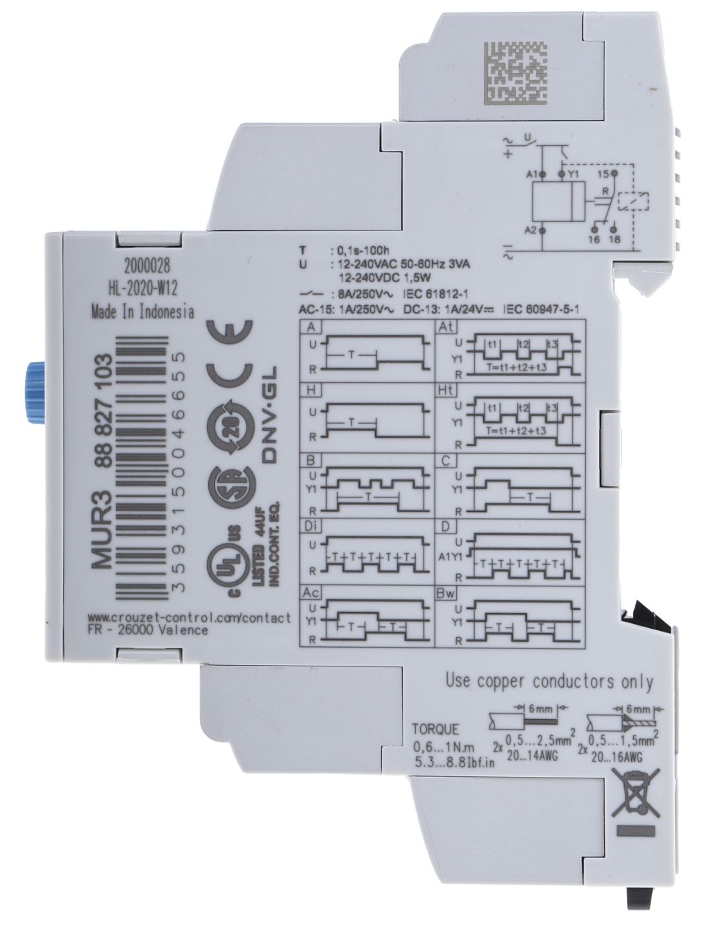 | Product description | Crouzet SPDT Multi Function Timer Relay, 12 → 240V ac/dc 0.1 s → 100h, DIN Rail Mount |