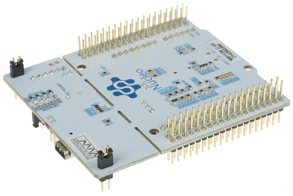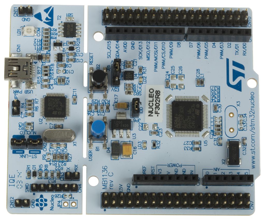 STMicroelectronics Nucleo development board will work with the STM32 F3 series allowing you to build your own prototypes for embedded applications; it also comes supplied with the STM32F302R8T6 microcontroller on-board.