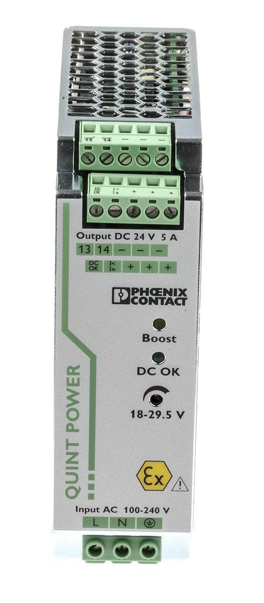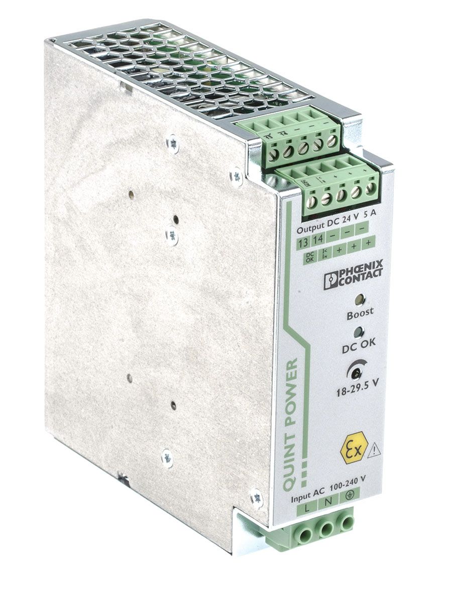 | Product description | Phoenix Contact QUINT-PS/1AC/24DC/5/CO Switch Mode DIN Rail Power Supply 85 → 264V ac Input, 24V dc Output, 5A |