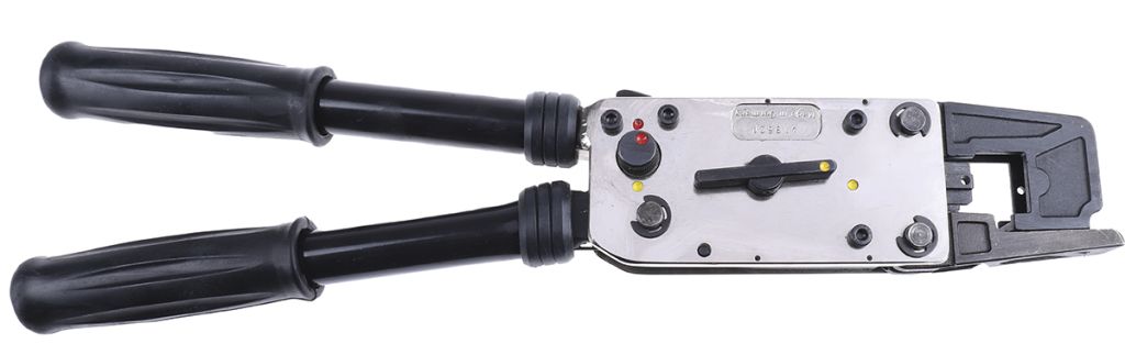 The rotating ratchet is designed to hold the cable lug or terminal securely between the dies until crimping is complete. Once the ratchet lever moves to the bottom position the crimping process is complete and the die is released. This mechanism ensures that a complete crimping cycle takes place and prevents partial crimps.