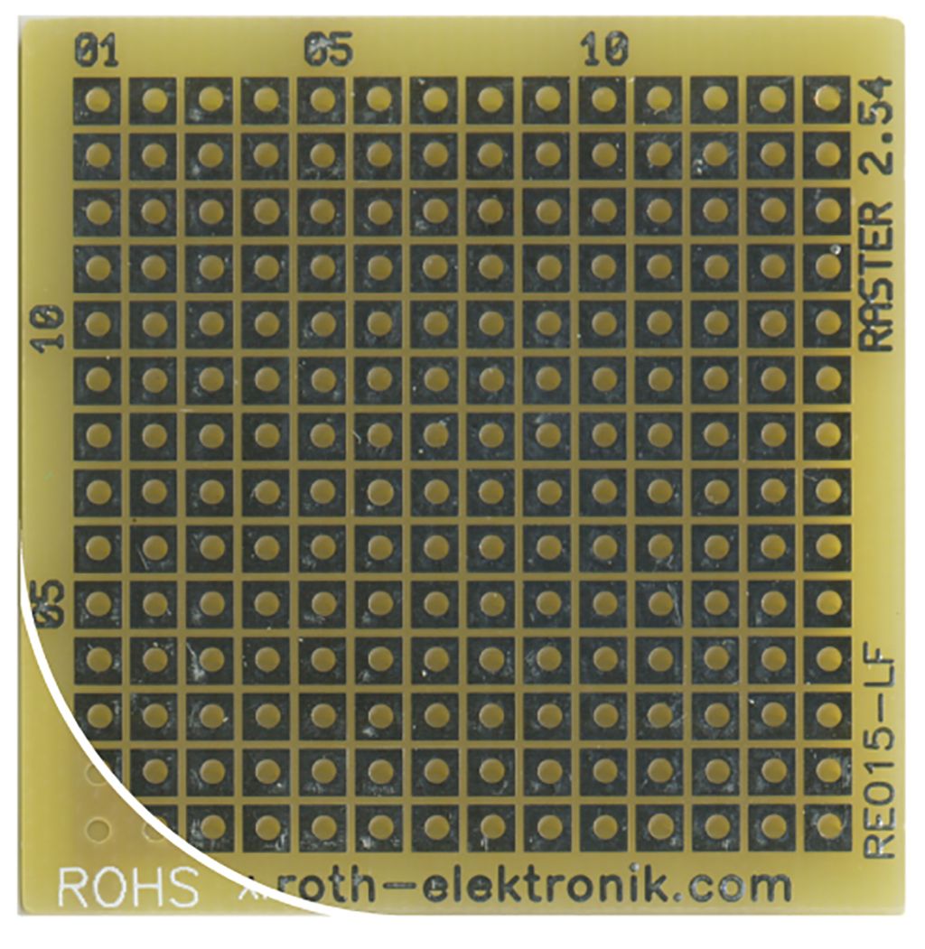 | Product description | Roth Elektronik Single Sided Matrix Board FR4 With 14 x 14 1mm Holes, 2.54 x 2.54mm Pitch, 40.5 x 40 x 1.5mm |