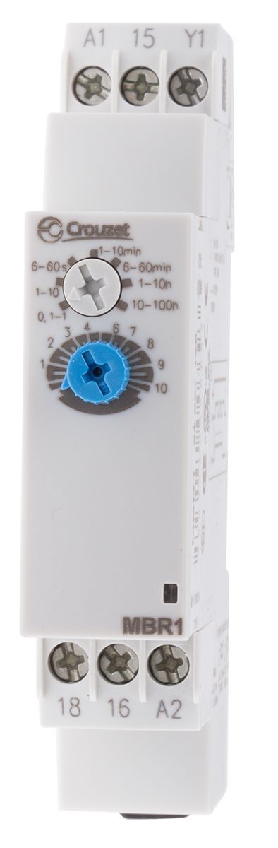 | Product description | Crouzet SPDT Timer Relay, ON Pulse Timer, 24 → 240 V ac, 24V dc 0.1 s → 100h, DIN Rail Mount |