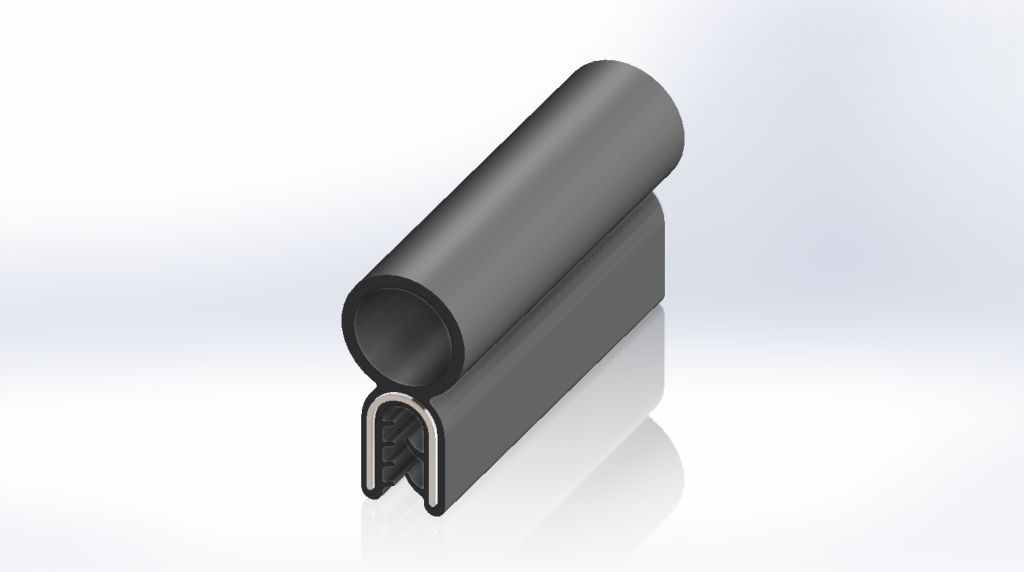 From RS Pro a high-quality flexible edge protector strip or edging strip made from EPDM rubber with a hollow sponge rubber sealing section bonded to it. This rubber edge protector strip performs two functions; the edge protector covers and protects the sharp edges of sheet material such as metal panels and the sponge rubber section provides additional sealing. The edge protector strip has a robust design which consists of a U shaped metal insert strip covered in an extruded black EPDM coating. A looped wire carrier is incorporated inside the strip. The edge protection strip is simply pressed into place by hand and the lips in the EPDM coating and teeth in the metal insert hold the inserted edge in place using a clamping effect. There is no need for any additional preparatory work, tooling or adhesives.