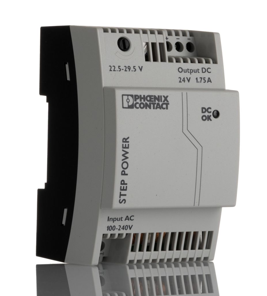 | Product description | Phoenix Contact STEP-PS/1AC/24DC/1.75 Switch Mode DIN Rail Power Supply 85 → 264V ac Input, 24V dc Output, 1.75A |