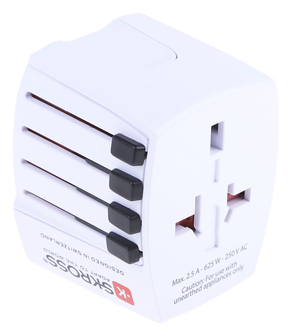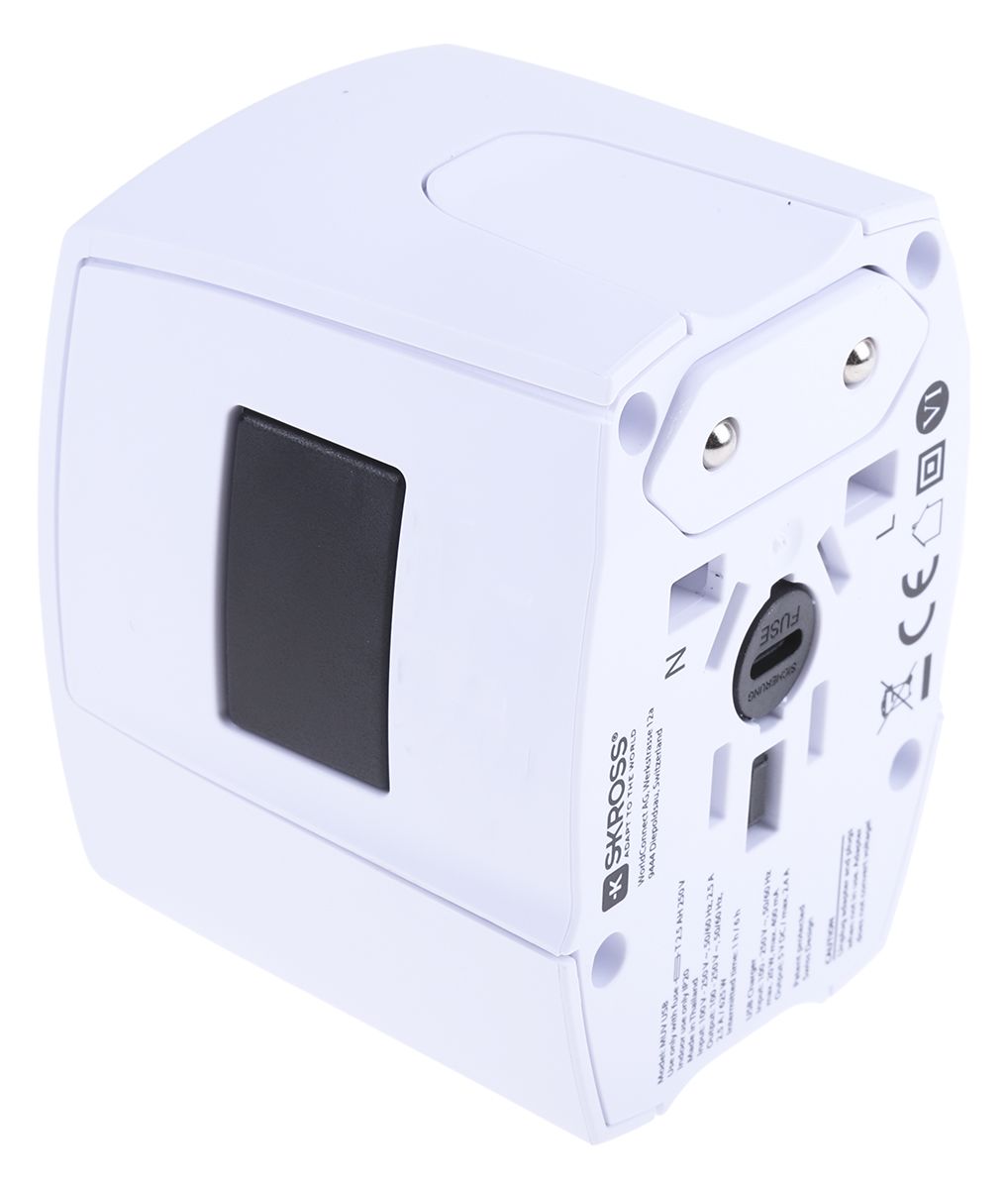 The World Adapter MUV USB is a compact versatile mains travel adaptor for unearthed 2-pole devices which also incorporates dual USB outlets.